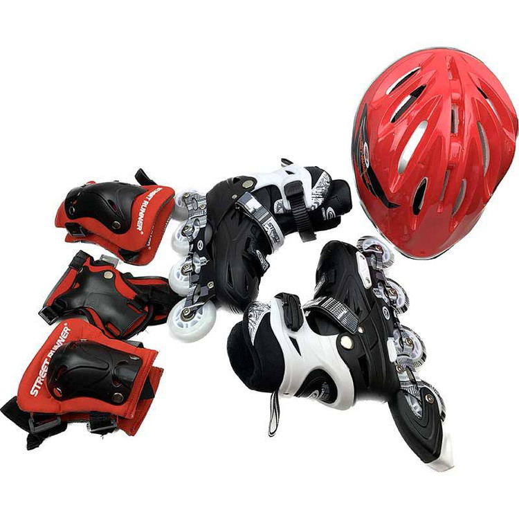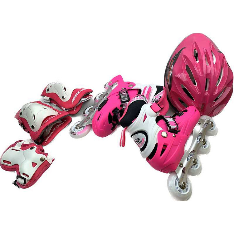 اسکیت قابل تنظیم مدل حرفهای – تایر هایپر ژلهای درجه ۱، همراه لوازم ایمنی (سایز S تا L)